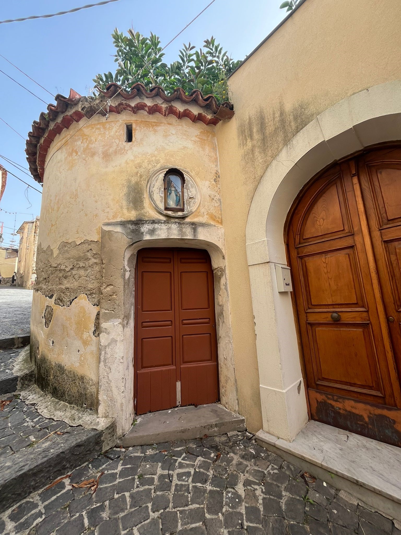 La piccola Cappella dell’Annunciazione, probabilmente trecentesca, di forma circolare, invade per metà il suolo pubblico esterno e presenta due ingressi, dal cortile della casa e dalla strada, ad attestare la sua duplice funzione privata e pubblica. L’altare è decorato da stucchi in stile barocco con angeli e drappeggi, che fanno da contorno ad una edicola semicircolare che ospita una tavola lignea raffigurante l’Annunciazione (a destra la Vergine è inginocchiata frontalmente, preceduta a sinistra da un angelo posto in posizione più bassa che porge un cartiglio con scritta; tra i due in alto una colomba), datata fra metà ‘400 e metà ‘500 e opera di un minore napoletano. Al di sopra della porta che immette sulla strada pubblica si apre anche un’altra edicoletta, con il rilievo di un francescano inginocchiato, e la scritta “ROCCO ROTOLO 1703”, ad indicare forse la data dell’ultima sistemazione della cappella.