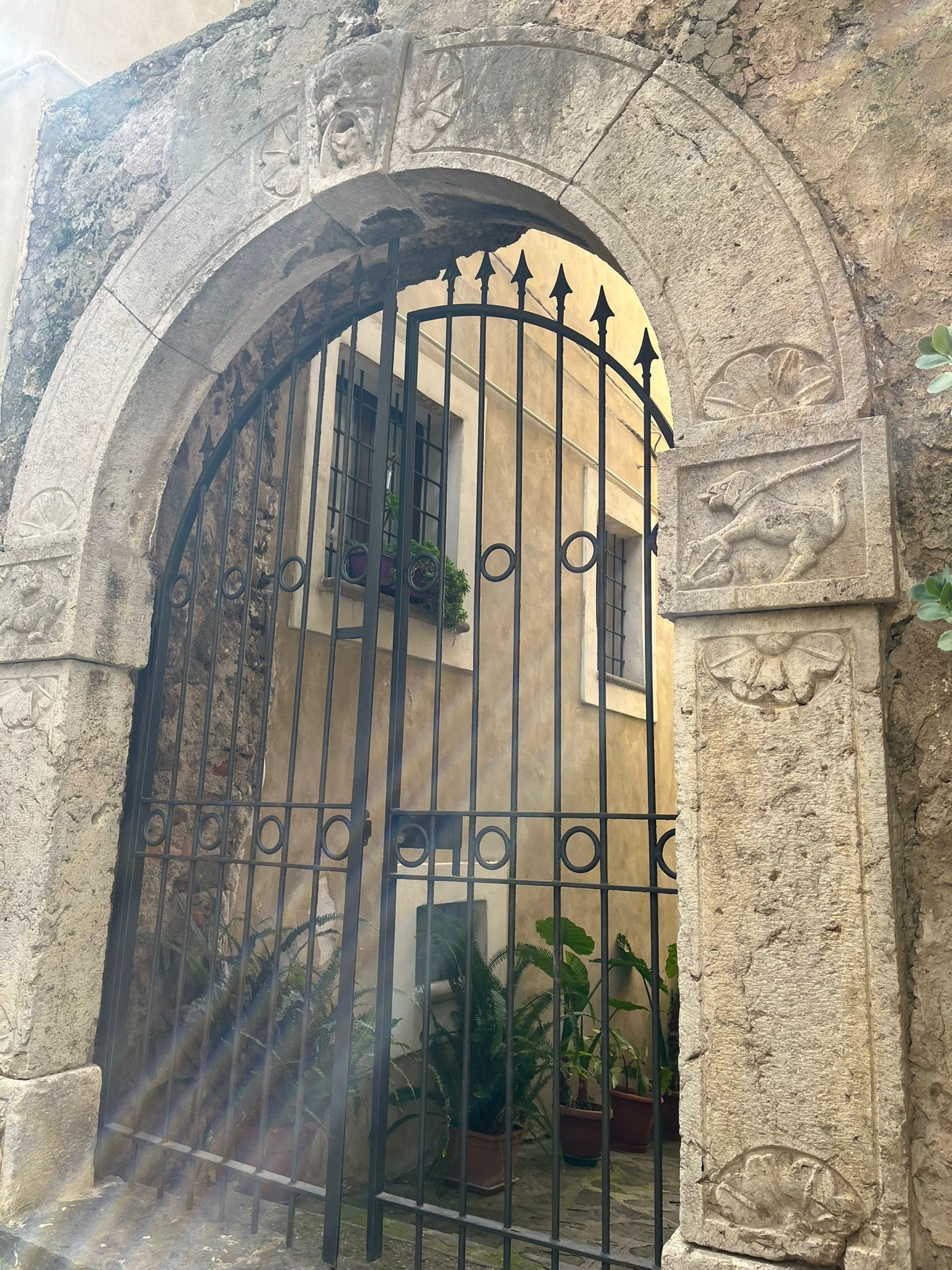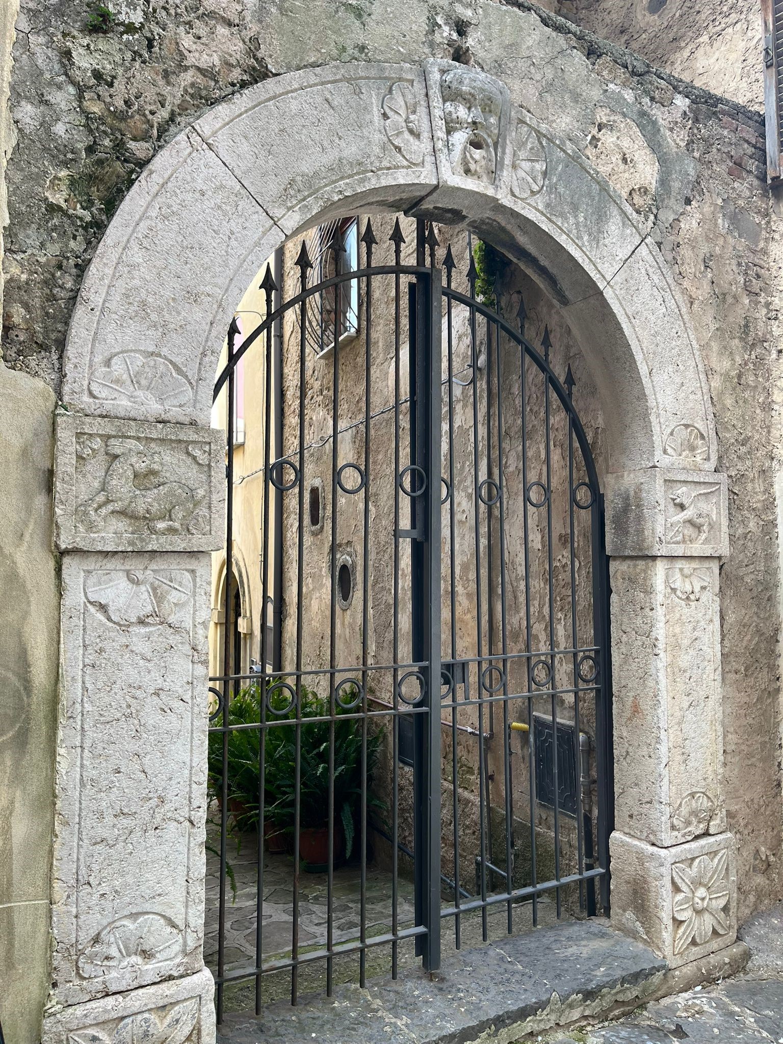 Scendendo dalla piazzetta Umberto I verso il Fortino, si trova un portale scolpito del XVIII secolo che fa da ingresso monumentale ad un cortile. L’arco a tutto sesto, in quattro pezzi, poggia su due blocchi quadrangolari scolpiti a rilievo; la chiave di volta raffigura un mascherone con bocca spalancata. Alla base, altri due blocchi scolpiti con un grande fiore ad otto petali.